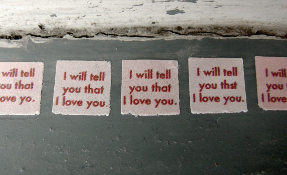 Responding to the color red for the second exhibition in a series called Three Colours at SOMA Contemporary, Waterford I devised a new piece using square pieces of paper and incorporating graded colour tones. Taking the circumference of Gallery 1 in SOMA as my guide I installed approximately 1,920 individual squares to the floor around the edges of the room. In each corner red stickers were installed that eventually bled out to a white/pink colour as you moved closer to the centre of each wall – thus highlighting the corners as focal points. The text on each square reads I will tell you that I love you. This is interspersed sporadically with squares that read I will stop talking to you about housework. The piece is virtually invisible in some respects and perhaps will only be discovered by a minority of viewers but this is very much part and parcel of the work. Below are images of the piece installed and you can click on here to see an interview I did for SOMA about A promise.