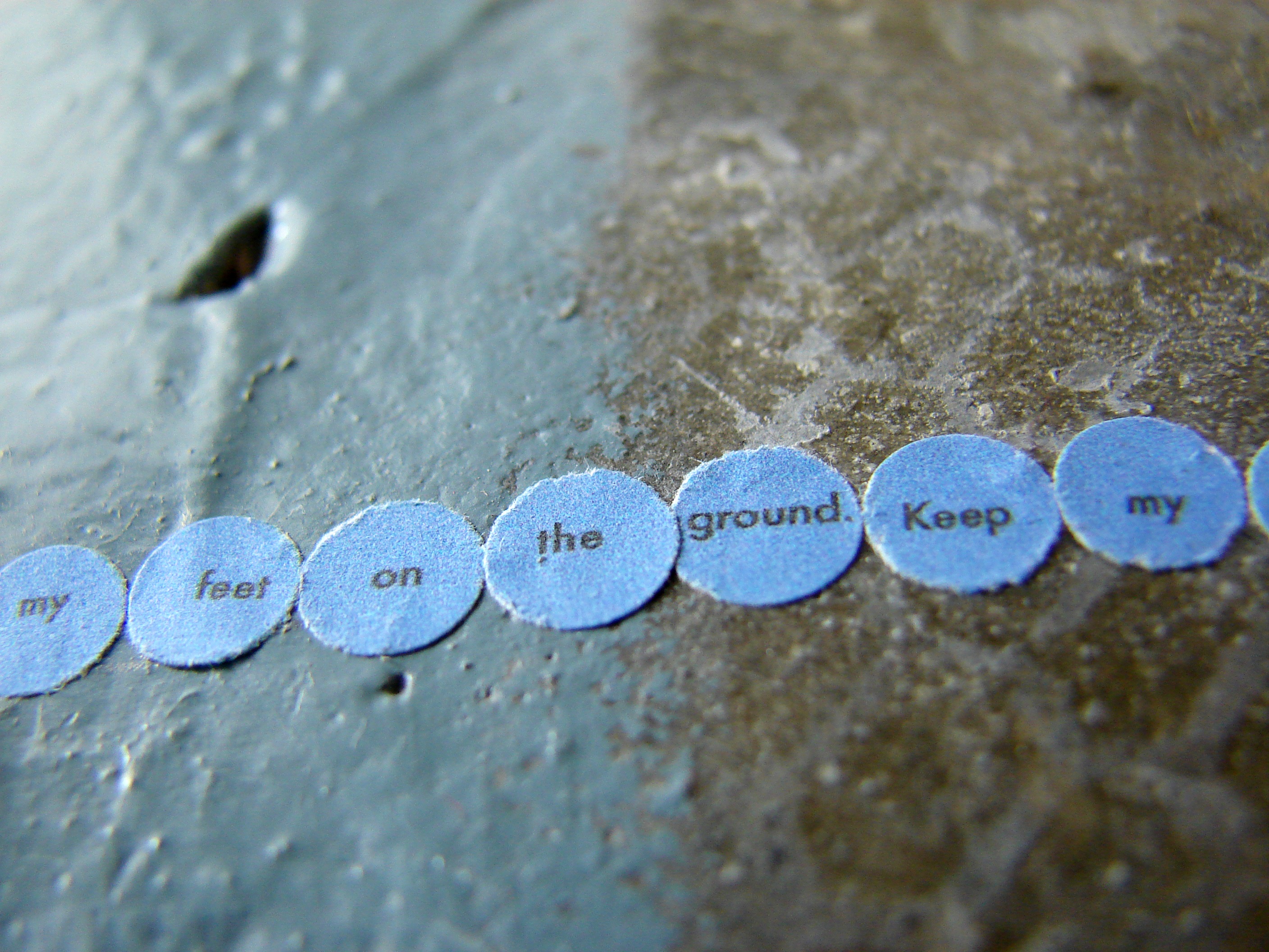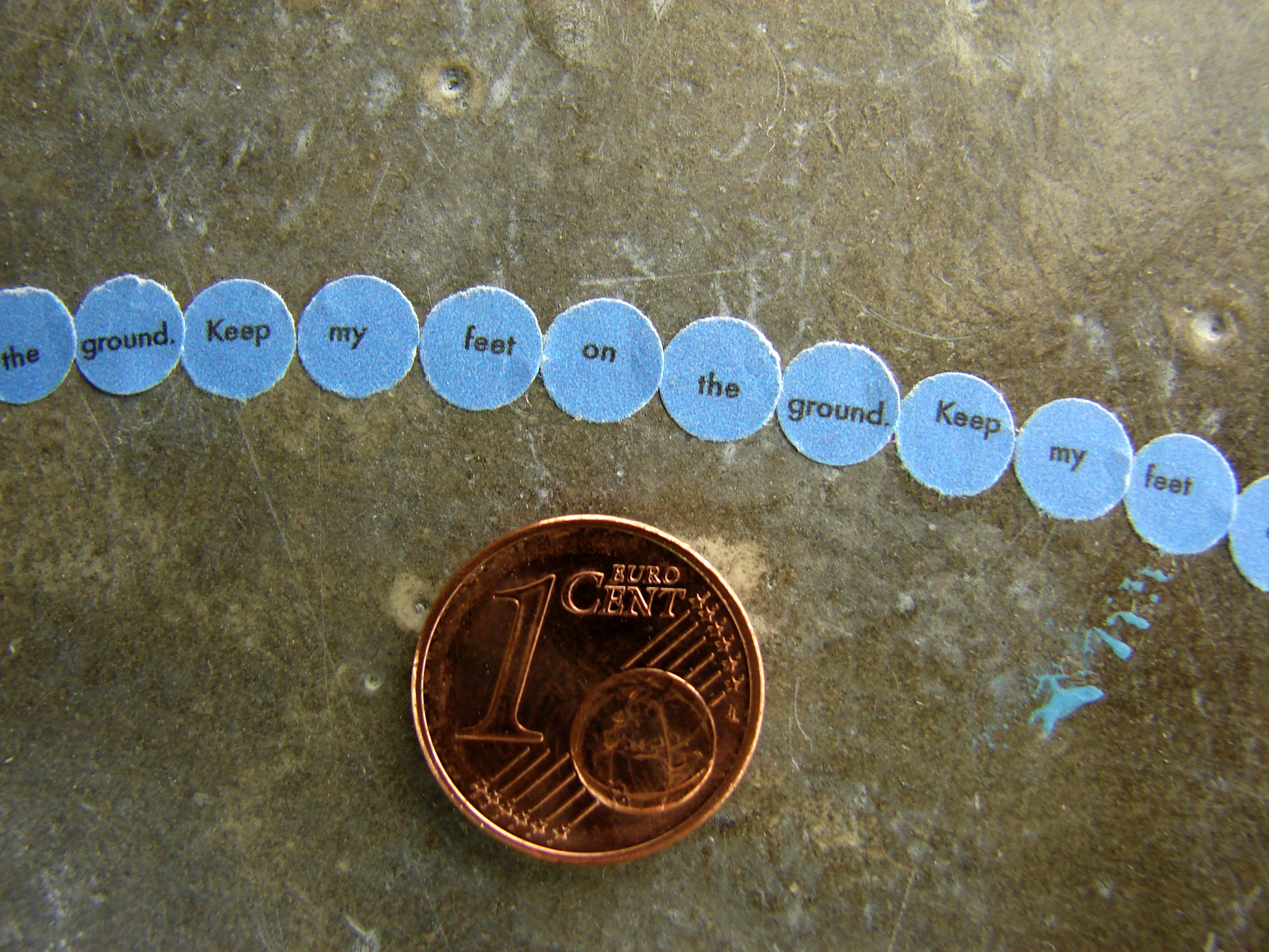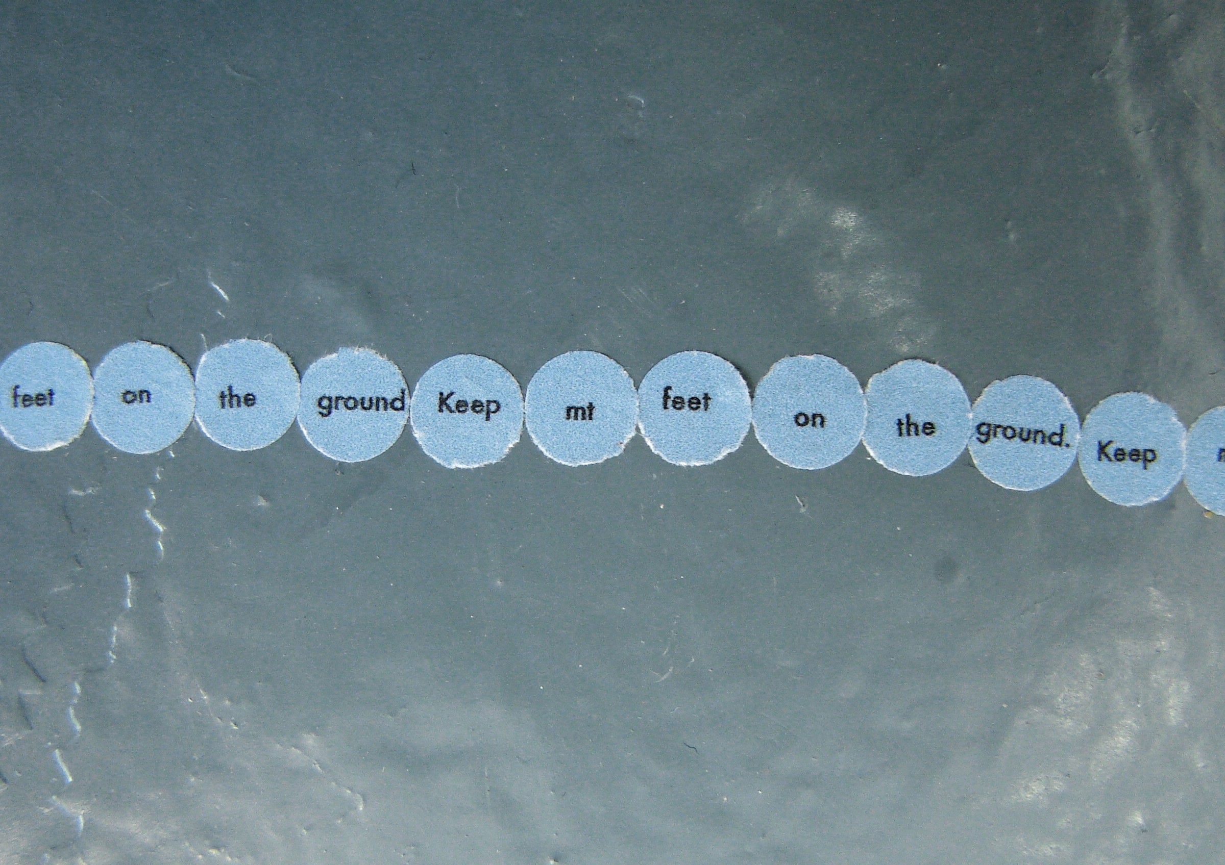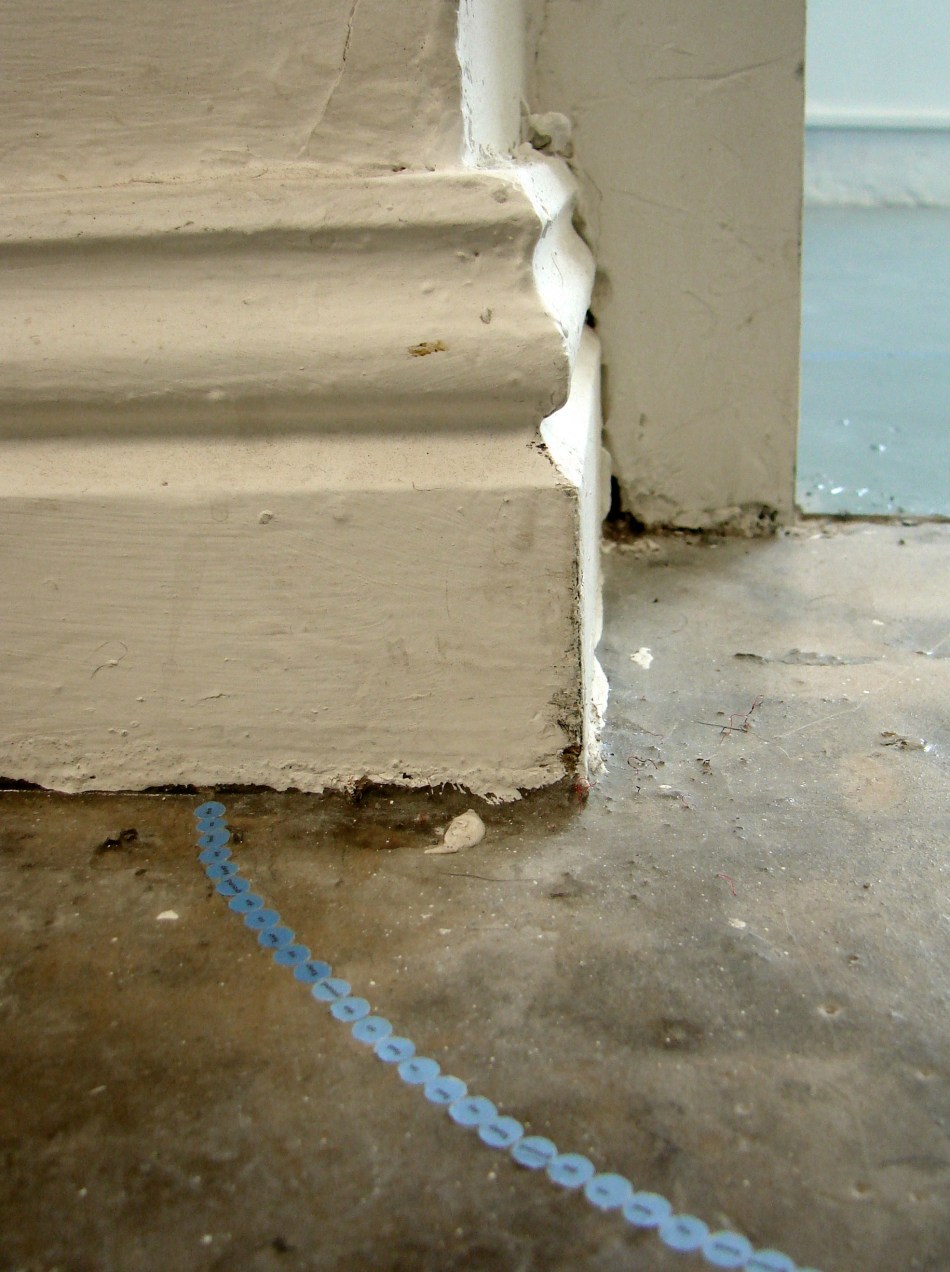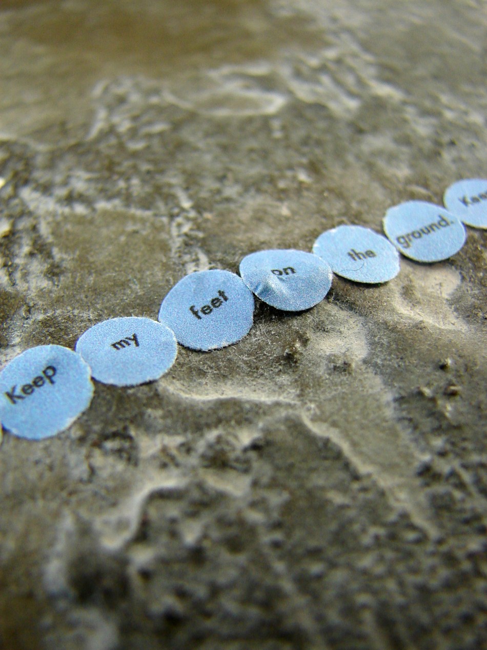 Responding to the colour blue I installed four circle pieces in SOMA in Waterford. Each piece reads – ‘Keep my feet on the ground’. Ordinarily I incorporate a different phrase/mantra into each circle but I was interested in considering this piece as a whole, made up of component parts. When you stand in each circle you can view the next circle in the sequence – this is not immediately obvious from the photographs but it is an important element of the work. It creates a physical narrative that is intended to lead the viewer around the space. Like a book it does not work in reverse – that is – starting from the last circle you can not necessarily see the previous circle in the sequence.