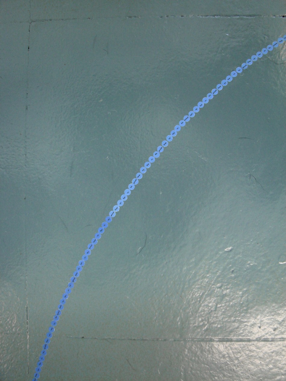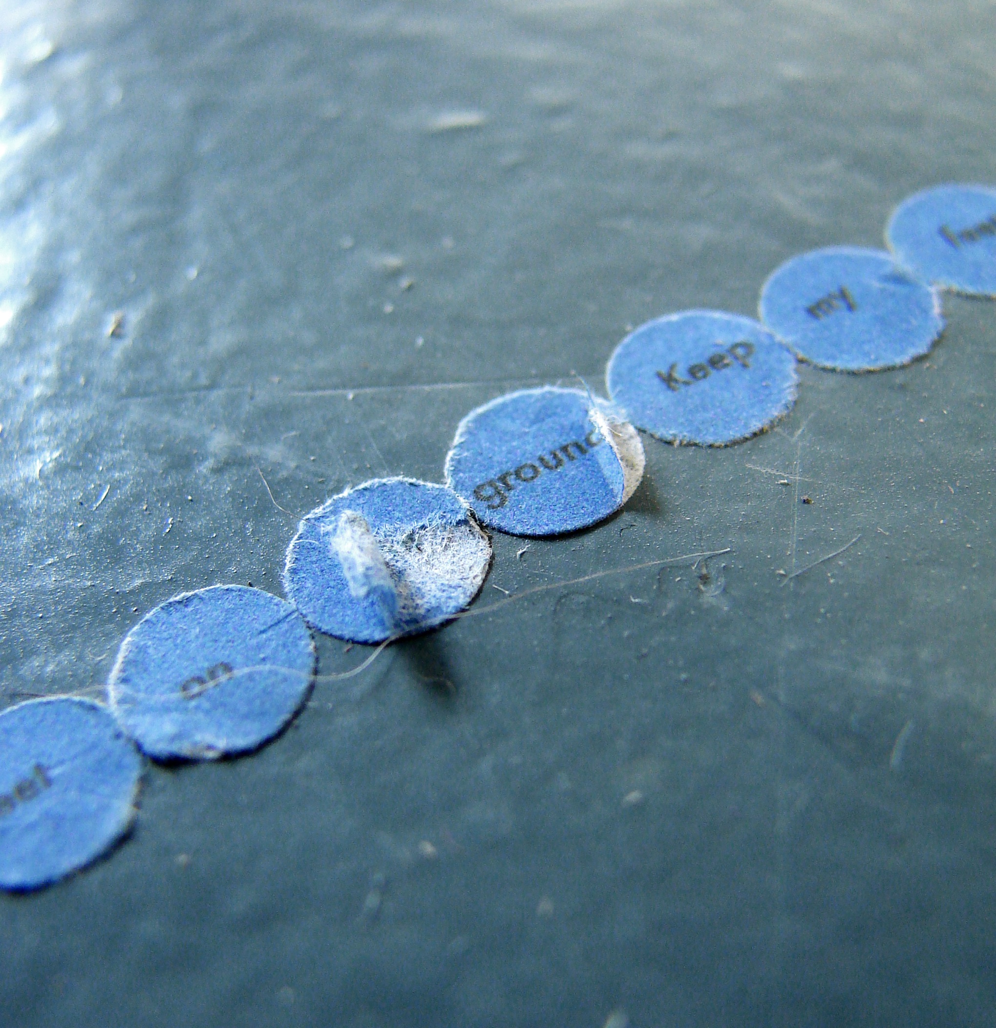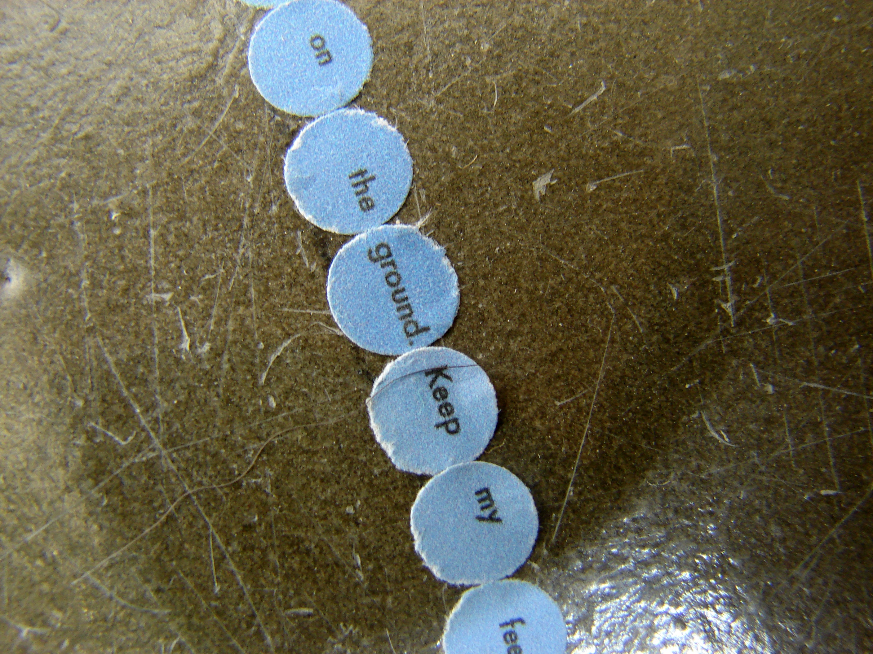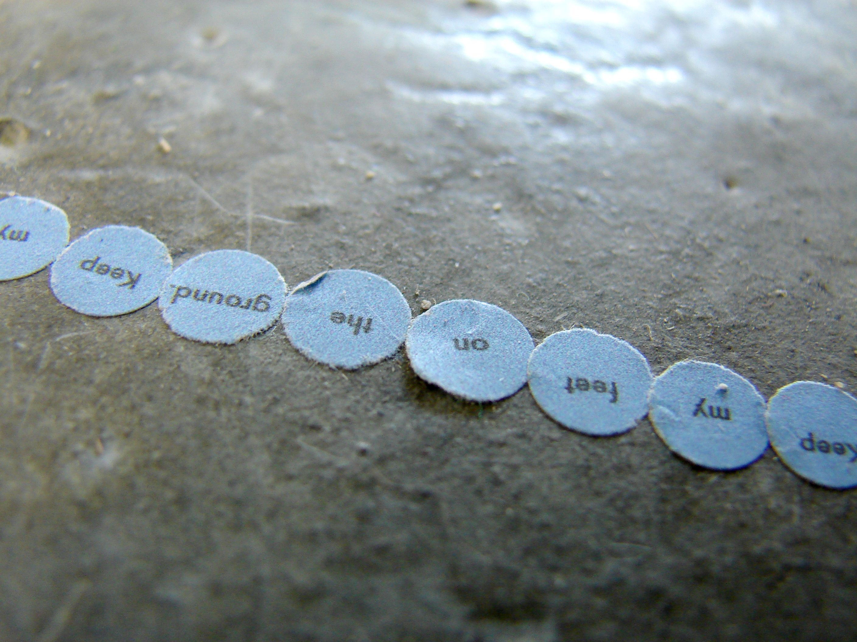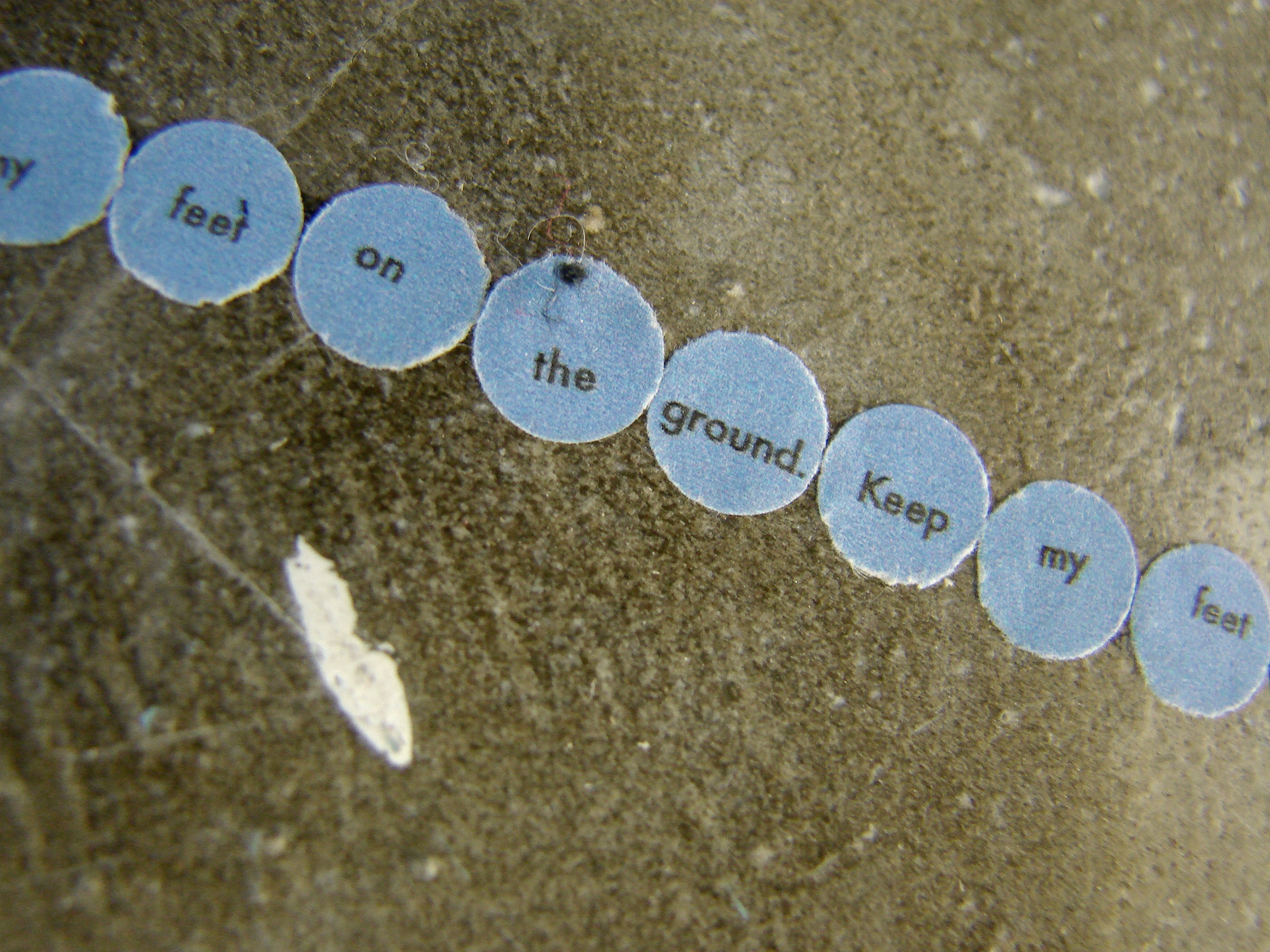 Responding to the colour blue I installed four circle pieces in SOMA in Waterford. Each piece reads – ‘Keep my feet on the ground’. Ordinarily I incorporate a different phrase/mantra into each circle but I was interested in considering this piece as a whole, made up of component parts. When you stand in each circle you can view the next circle in the sequence – this is not immediately obvious from the photographs but it is an important element of the work. It creates a physical narrative that is intended to lead the viewer around the space. Like a book it does not work in reverse – that is – starting from the last circle you can not necessarily see the previous circle in the sequence.